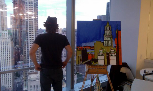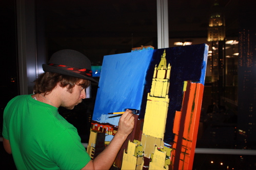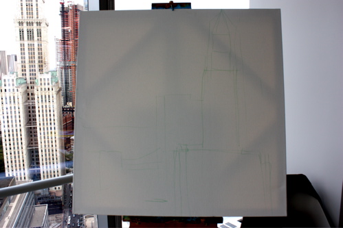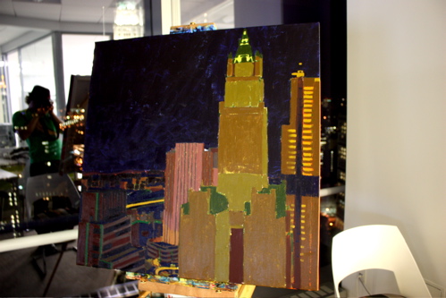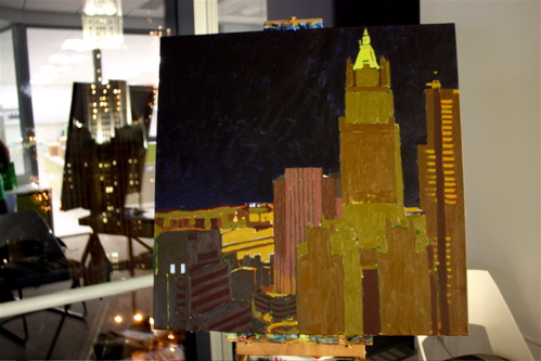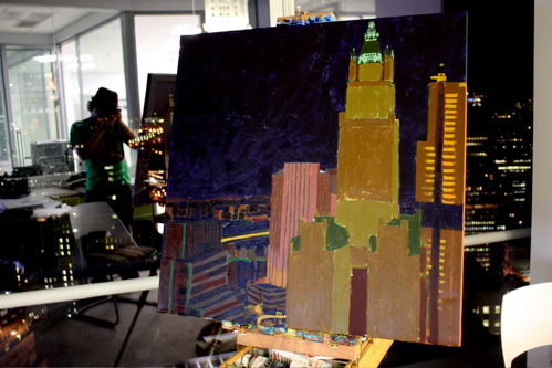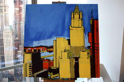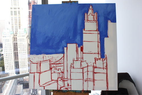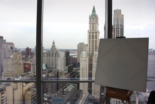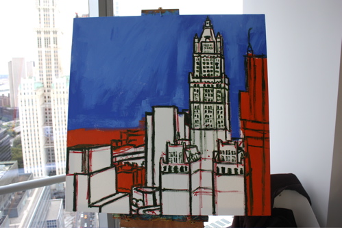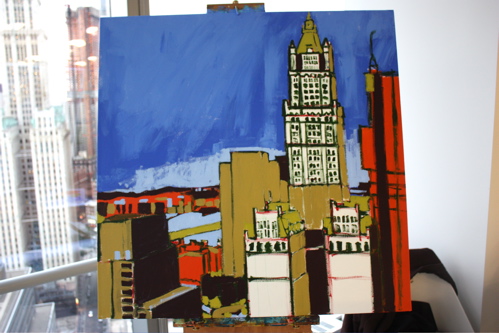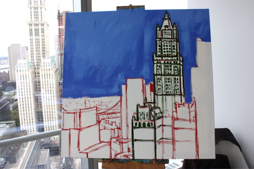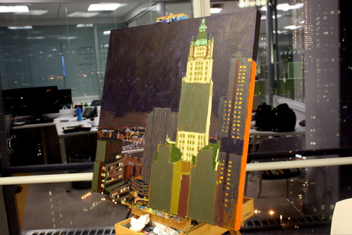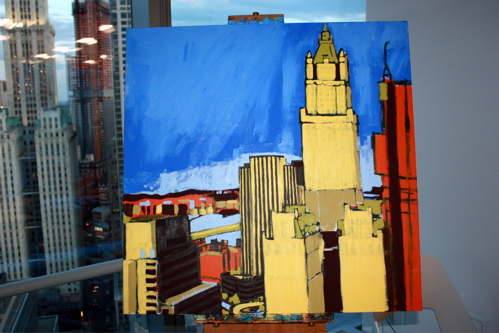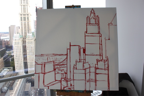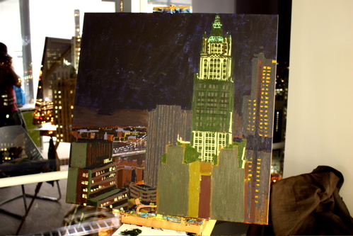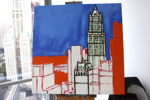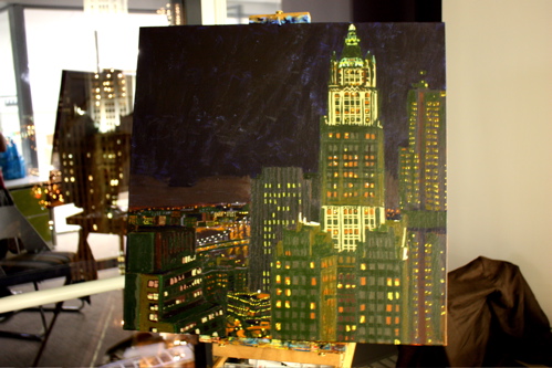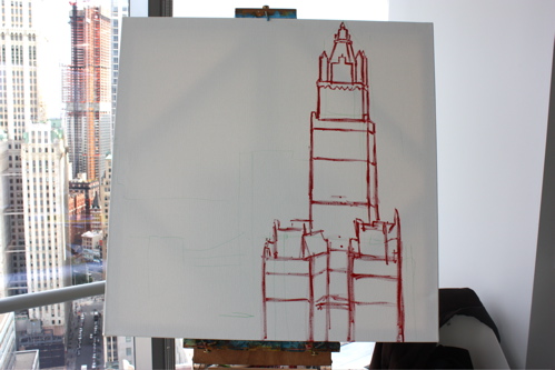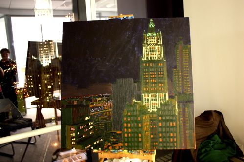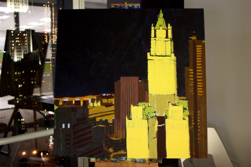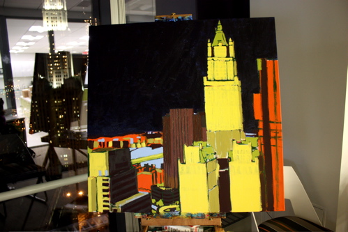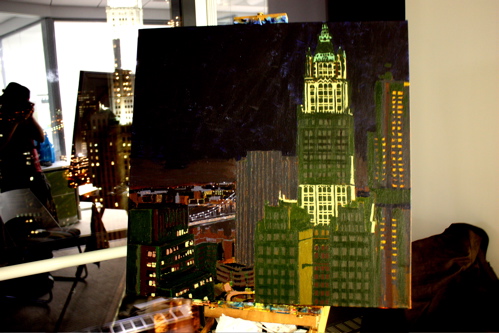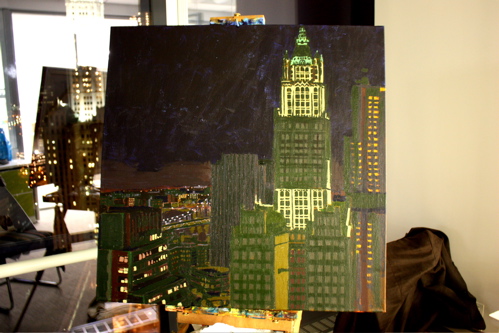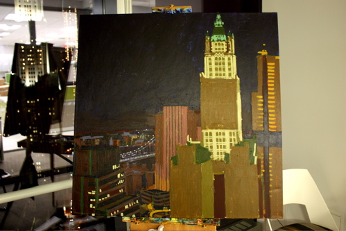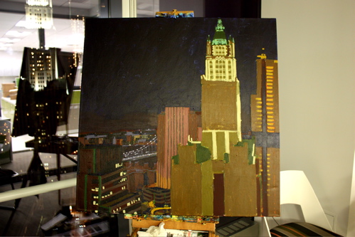 Here is where the canvas ended after day one. Tonight, I will begin cloaking the picture in darkness and painting in the lights of the building. The Woolworth at night is quite a sight, and I am hoping the composition will showcase it’s beauty. Thanks again to Mr. Wender and WhenTech for access to their beautiful office.