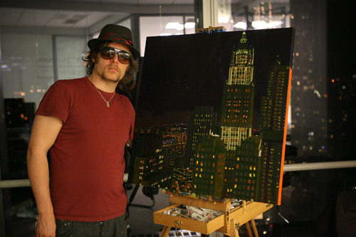 My painting of the Woolworth Building from financial technology leader WhenTech’s 34th floor 7 World Trade Center office has been completed. The first sessions focused on creating the structure during the day. Subsequent efforts included darkening the picture, then recreating the man-made lights at night.