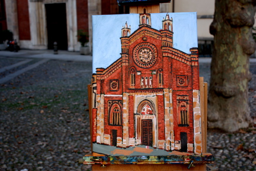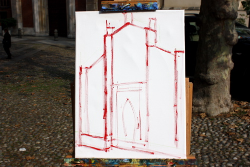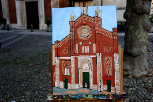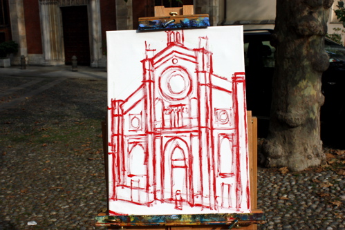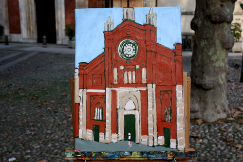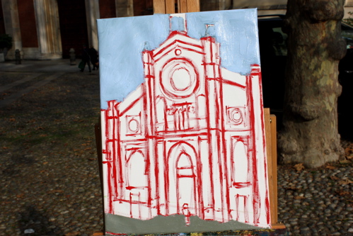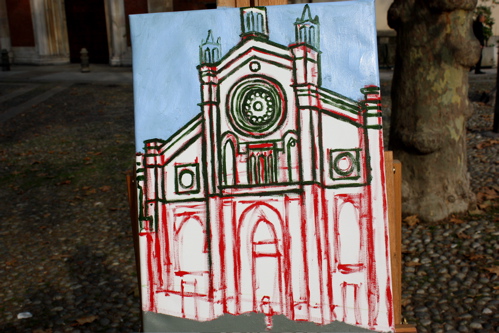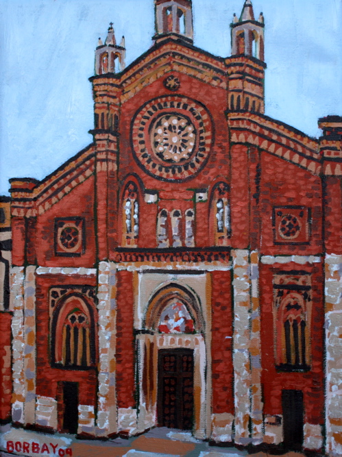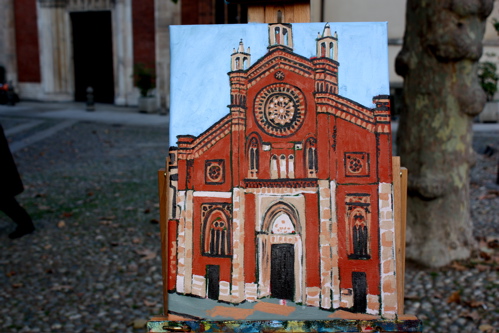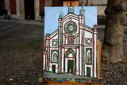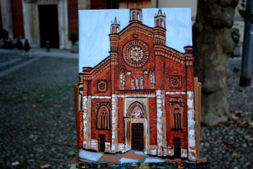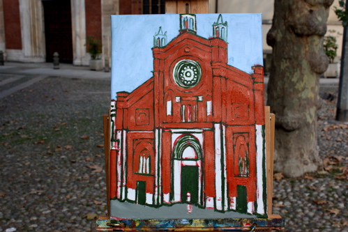 Still wet, here is my first painting completed in Europe: San Marco Cathedral, in Milan. Located in Brera, this house of worship with a futbol field in the courtyard was built in 1254. It was since renovated in 1879 with a new brick facade (fact courtesy of Time Out Milan), yet retains a certain charm.