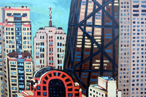Now, the fun part… mixing interesting reflective colors and adding the windows throughout the canvas. While painting a building over the course of multiple sessions, the windows take on the characteristics of a thousand blinking eyes.