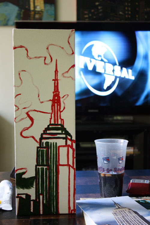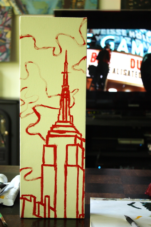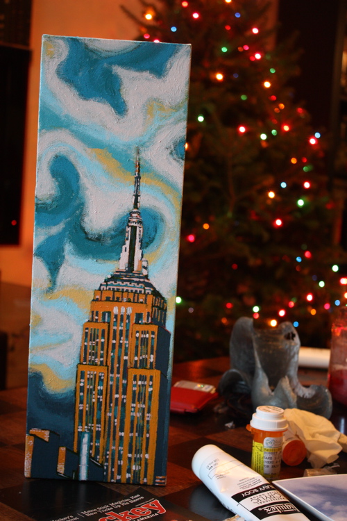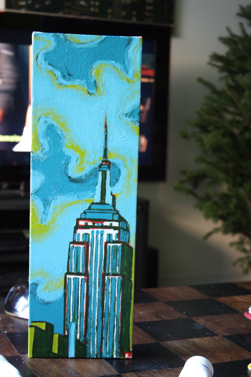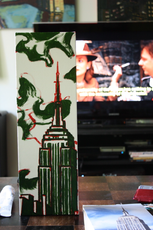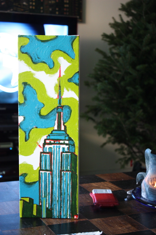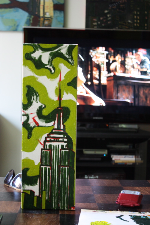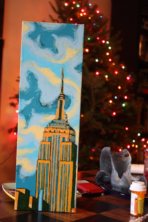 Sometimes there’s a man. Sometimes, that man spends 14 hours a day sitting on his couch, leg elevated, popping painkillers. That man is me, and this painting, is a 6″X18″ rendering of the Empire State Building. To date, I have done many Chrysler Building pictures, so it was high-time for an Empire.