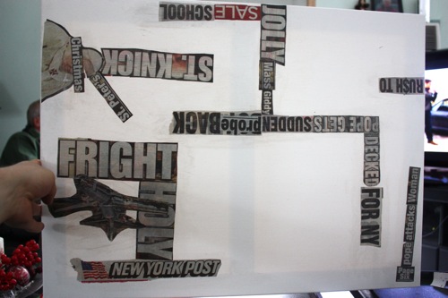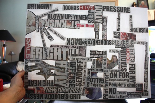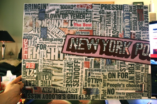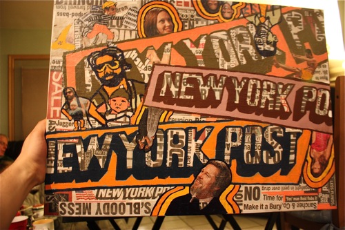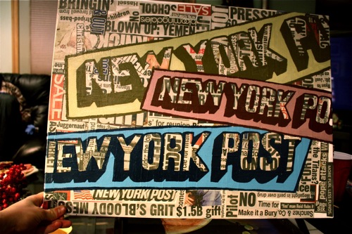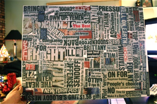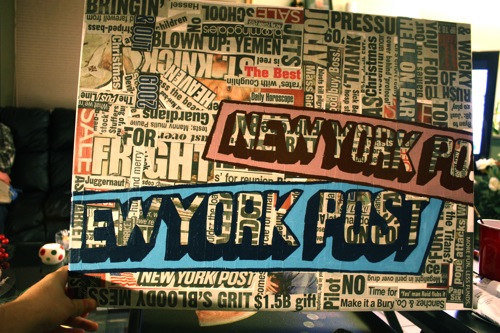 The New York Post + US Weekly + Acrylic Paint + Californication + Dexter = Christmas Painting Collage. As always, a traditional Borbay Christmas consists of the important ingredients as listed in the mathematical equation above. After the jump, my stream of conscious collage painting.