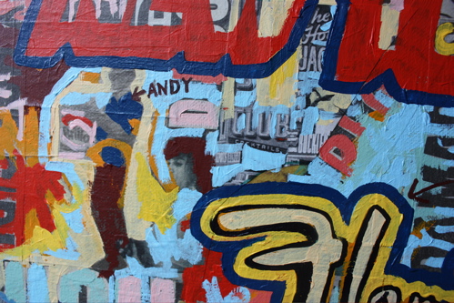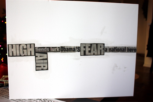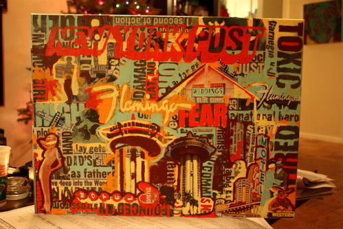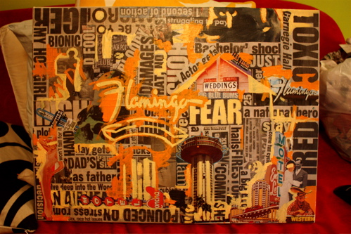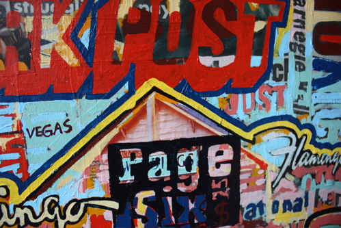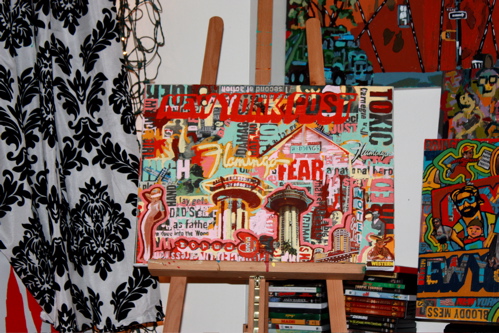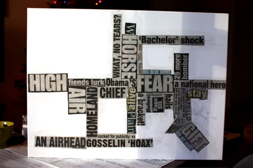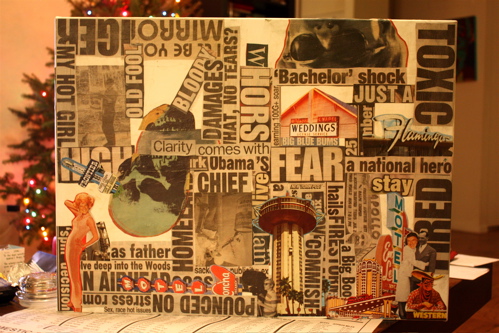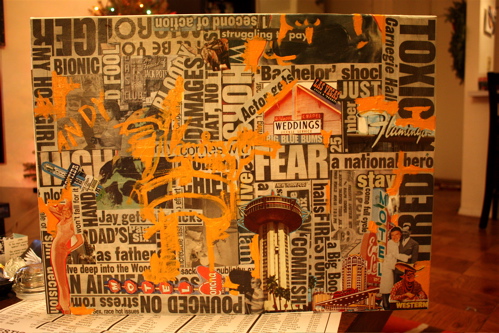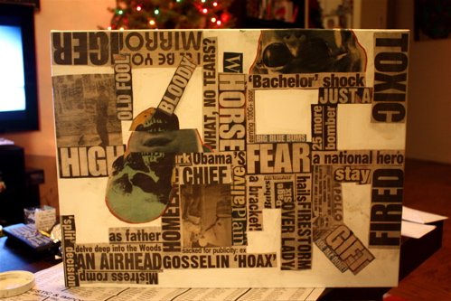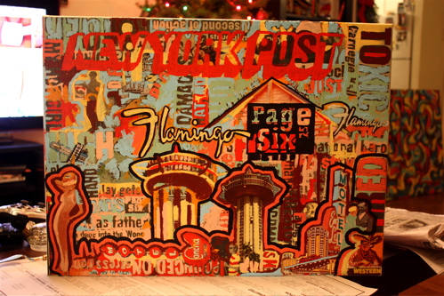 Instead of tossing my daily delivery of the New York Post, I decided to turn them into art. My lady Erin gifted yours truly six 18″X24″ canvases for Christmas, a perfect size for collage paintings in a growing series. This set came to be after I spent some time looking at a piece I made back in 2003 (below) over the holidays.