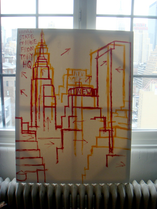 Working the Time Out New York logo into the Empire state, as well as some teal blues. And here is where the canvas lies after two sessions. Up next… finish the outlines, work another six color cycle, and begin to focus on the luscious twilight… light.