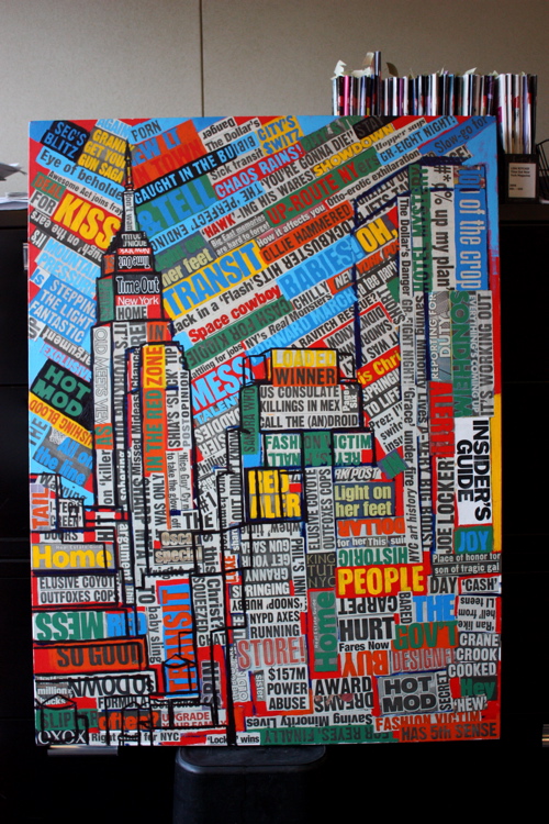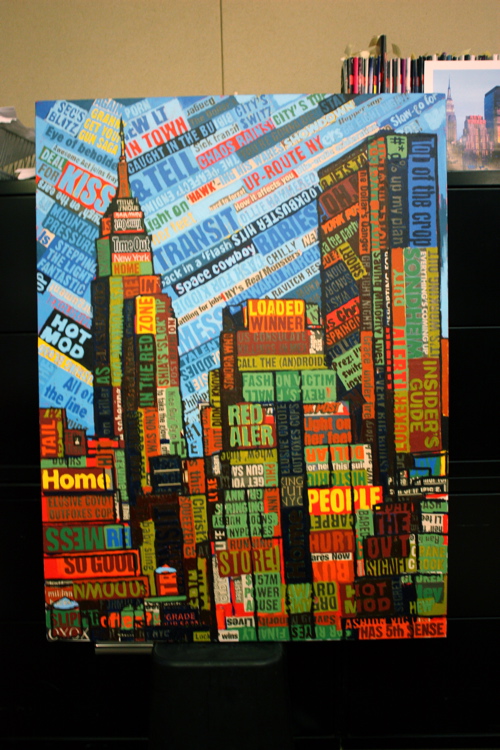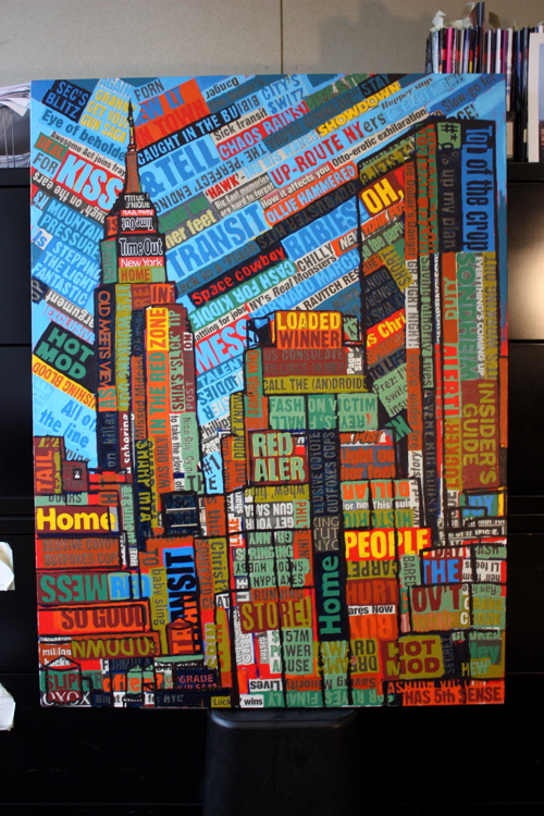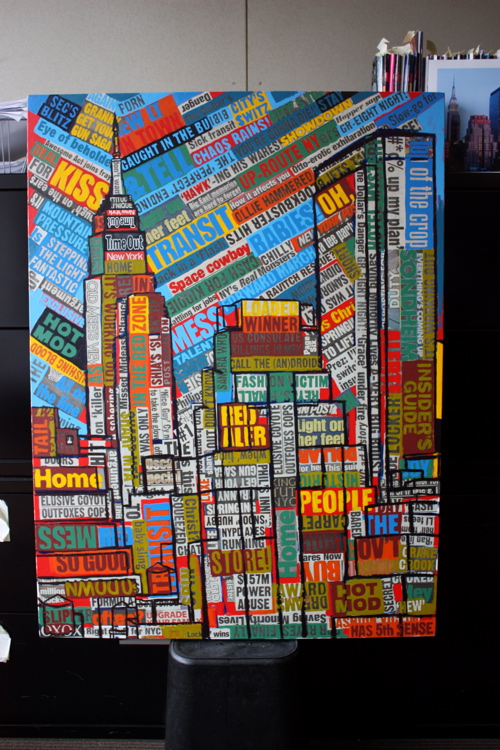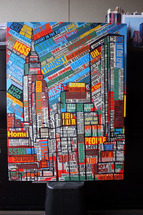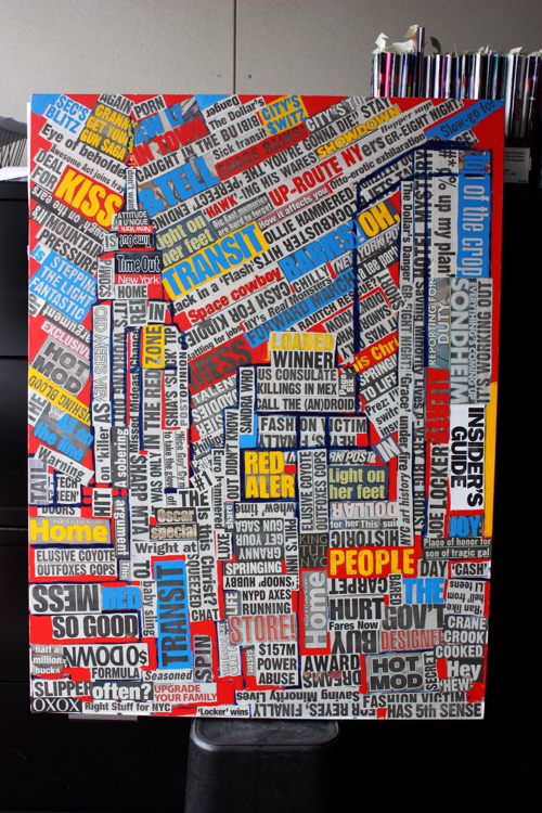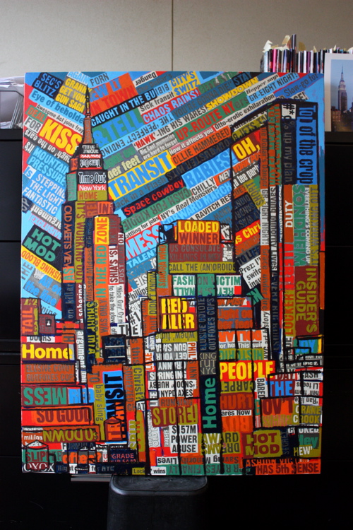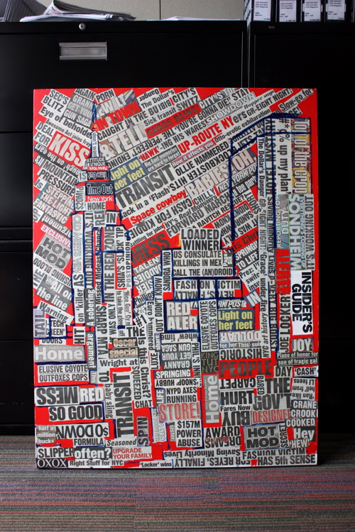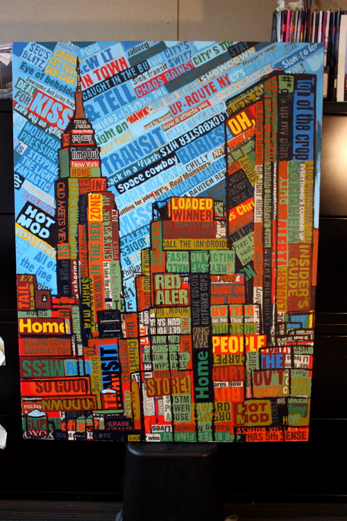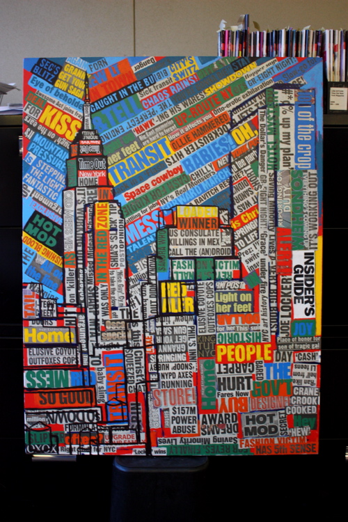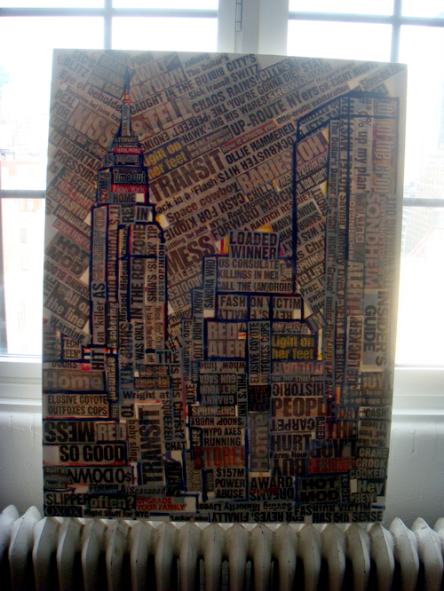 While off-center, I wanted the Empire State to be the focal point, so I began collaging my carefully trimmed New York Post headlines with a vanishing point located somewhere around Nassau County.
