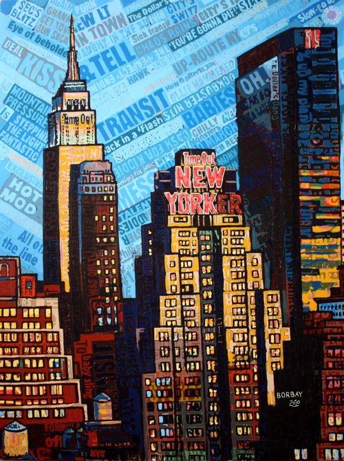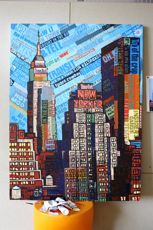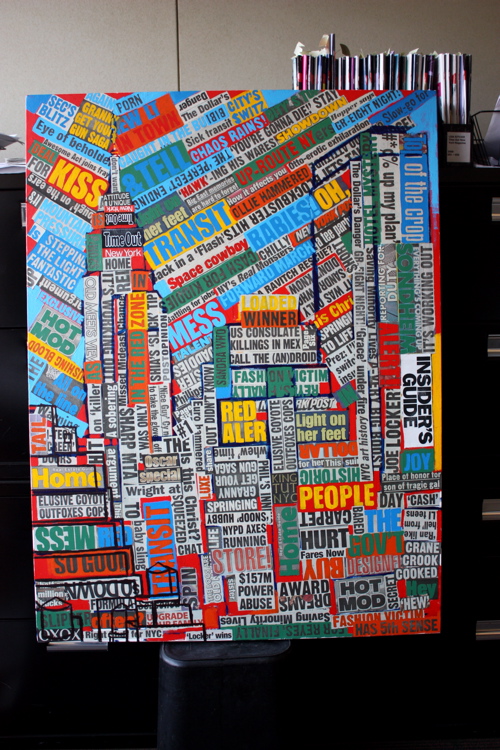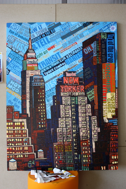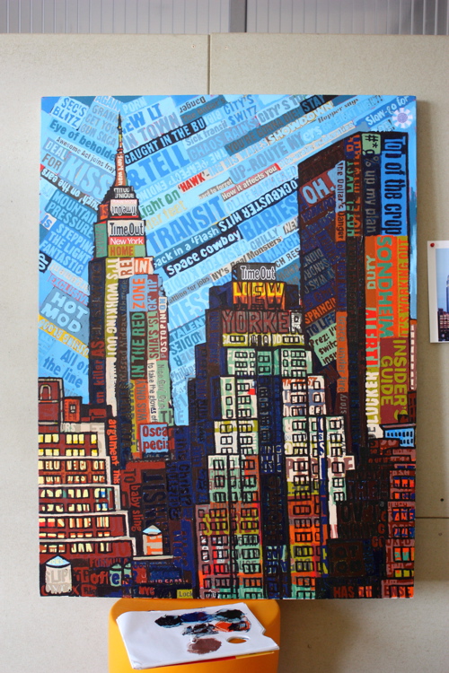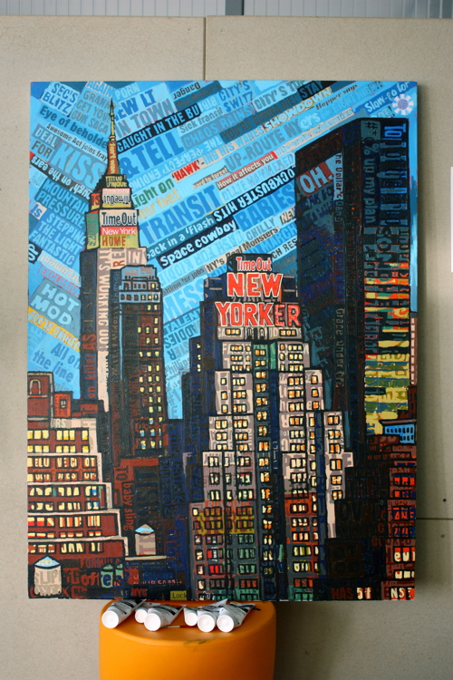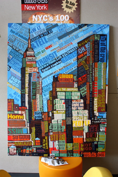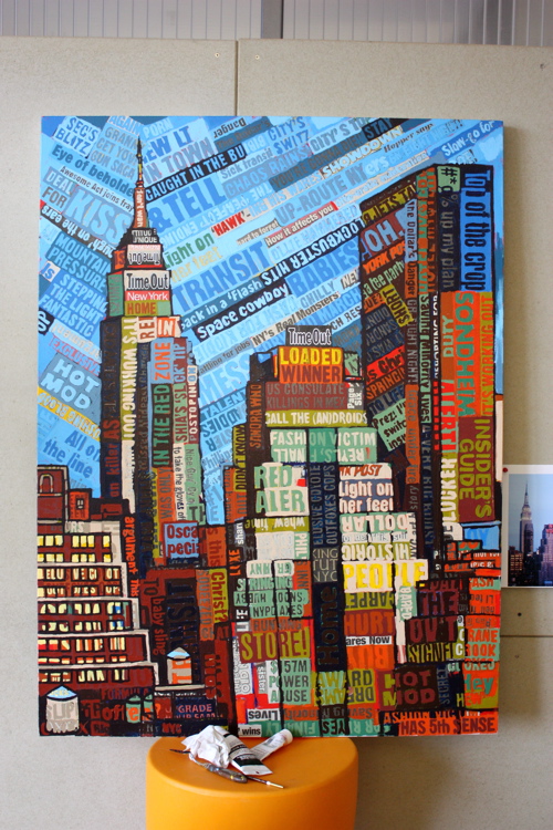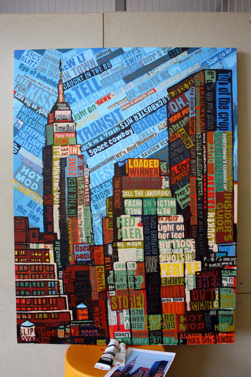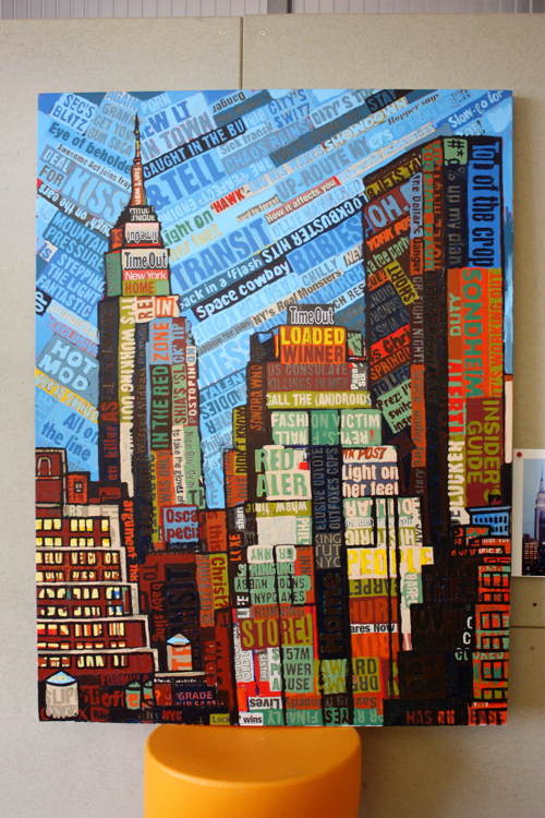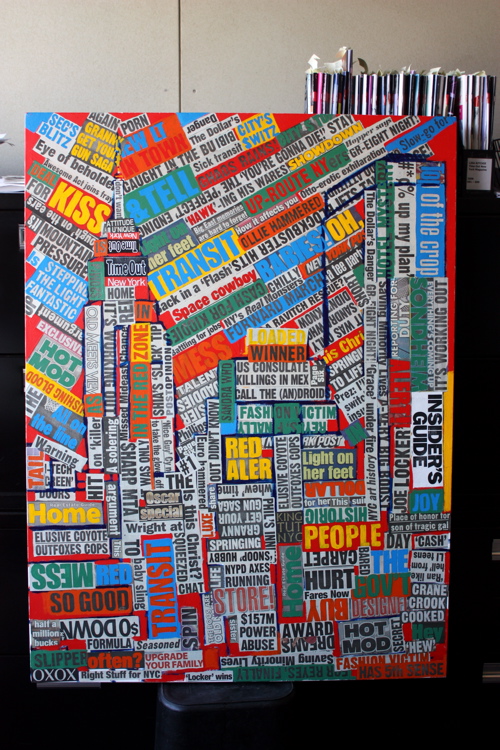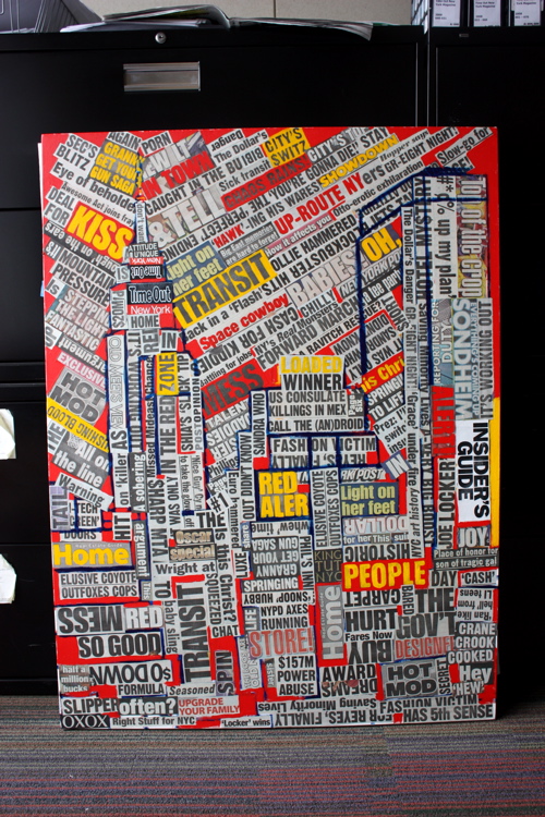While off-center, I wanted the Empire State to be the focal point, so I began collaging my carefully trimmed New York Post headlines with a vanishing point located somewhere around Nassau County.