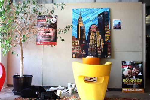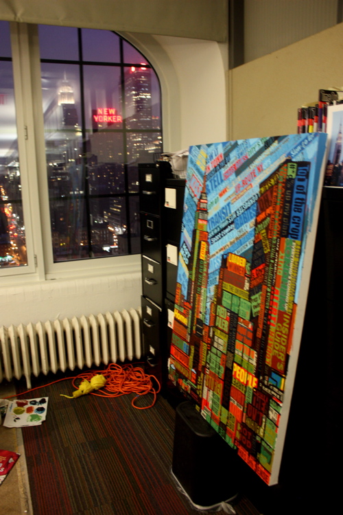 The final piece in context with its surroundings. Working at Time Out New York has been a blast. My painting will hang out there for a while, soak up the good times, and will be on shown downtown in a few months (stand by for details.) I want to thank Cristina Velocci for getting me introduced to Nina Topiel, who was amazing in allowing me to set-up shop. Everybody treated me like part of the team, and I was pleased to get to know some great people, like Marc Whalen, a crazy talented artist himself; Nicola, John, Lindsay and John. I greatly appreciate the shouts by way of Time Out’s Twitter and Tumblr accounts, and look forward to staying in touch with the entire team.