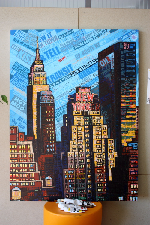 My 3’X4′ painting of Time Out New York‘s 12th story view is now complete. A little back story: After being named Time Out New York’s Most Creative New Yorker (a title I do not sew onto my blazer, but do use to help sell paintings and commissions) – I decided to ask Time Out if I could set up shop, and paint the view from their West Side offices. After getting the go-ahead in December, I broke my leg playing hockey and had to wait three more months.