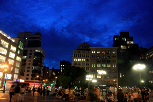 The square of union. Twilight. Lots of people hanging out, doing drugs, sipping beers, getting ready to make some mistakes.