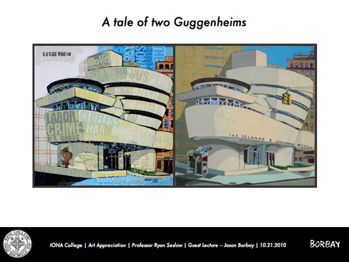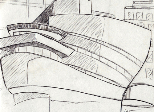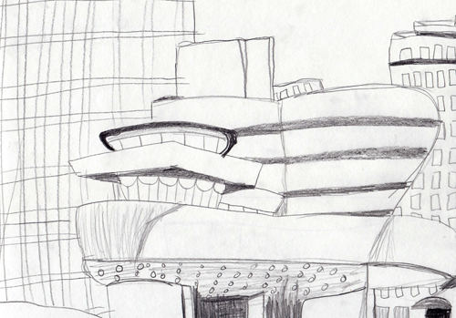 The class was highly receptive, asked some incredible questions and even spent 30 minutes drawing the Guggenheim. After the jump, my presentation slide-by-slide, as well as the resulting class drawings.