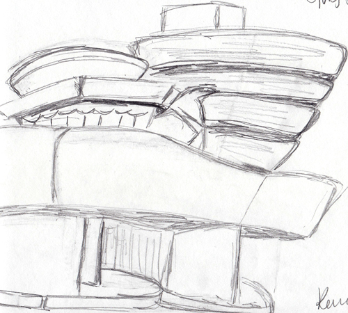 At the end of the presentation, Professor Seslow suggested we put up a slide and allow the class to spend a half hour drawing. The chosen slide was a Tale of Two Guggenheim’s — for a group of students who said they can’t draw, I think you will agree, the results are inspired.