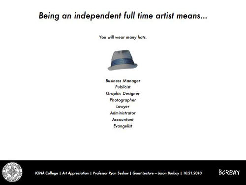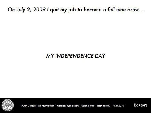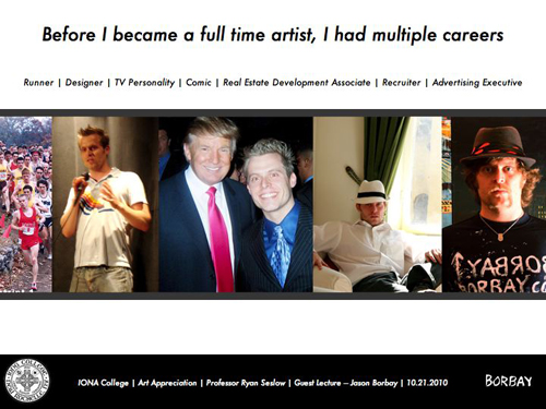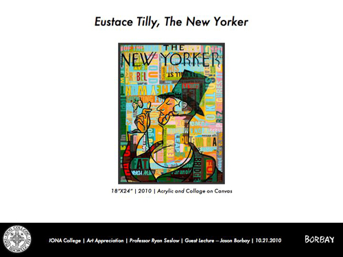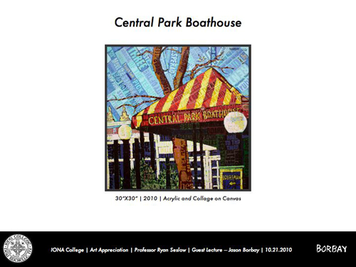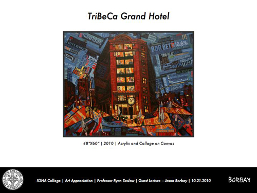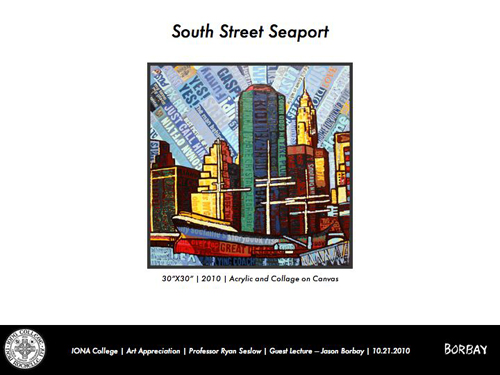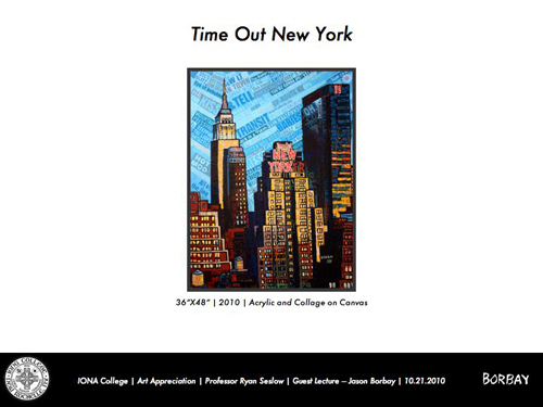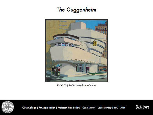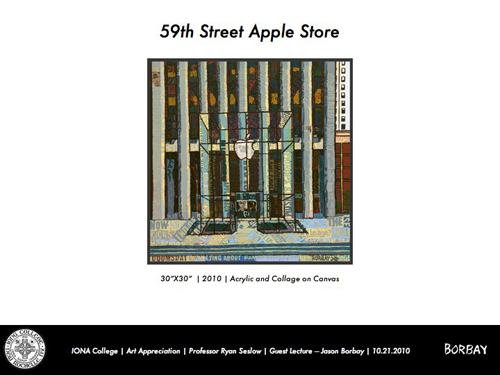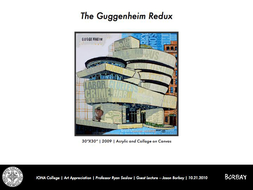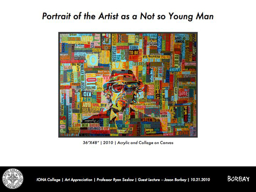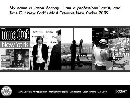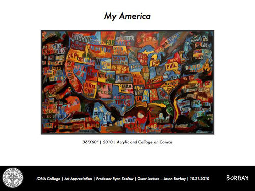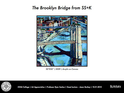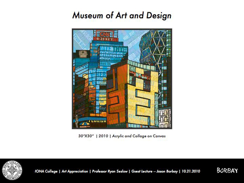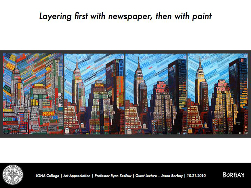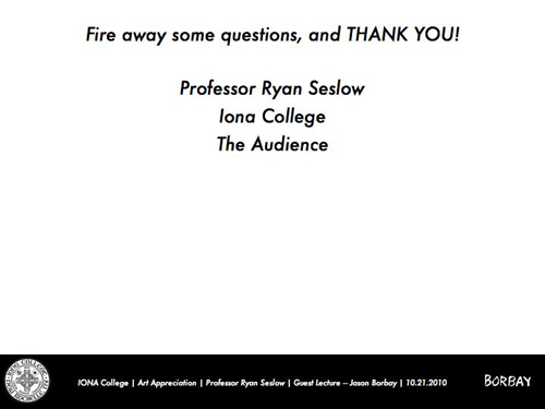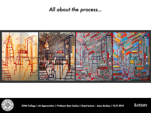This past Thursday, I had the honor of guest lecturing at Ryan Seslow‘s Art Appreciation Class at Iona College. Professor Seslow, Iona College and the students welcomed me with open arms. My objective was to visually introduce my background, work, process and daily routine.