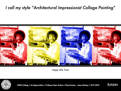 When I have showed Bob Ross to High School students, many of them look at me like I myself am a relic. Fortunately, the gang from Iona knew all about Happy Little Trees.