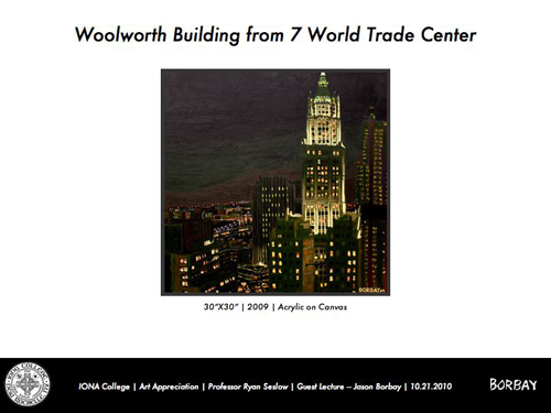 As I learned through many client presentations, the less words on a slide, the better. When introducing my work, I like to tell the intangibles versus the obvious. For this slide, I shared how and where I painted it — from WhenTech‘s corner office at 7 World Trade Center at night.