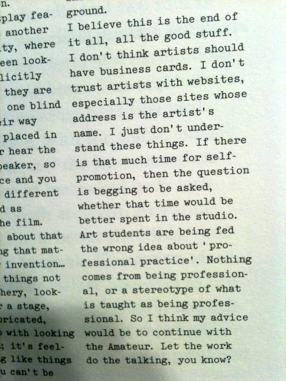 If an artist paints a beautiful picture, and nobody sees it, is it still beautiful? Friend and fellow artist Ari Lankin passed along this snippet from an interview between Hans-Ulrich Obrist and artist Ryan Gander which I must address.