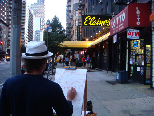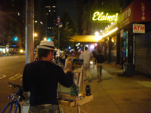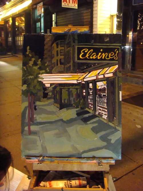 Riding my passion for Elaine’s, I decided to create a painting of the restaurant. While I was painting, Elaine’s chef came by and said “Elaine will love this.” A few months later, Erin and I strolled into the bar, grabbed a drink, and told Kevin (the bartender) we had a delivery for Elaine. Moments later, Elaine invited us to join her at her table. She took a moment to admire the painting in person (she saw it on my phone at some point), and ordered up a round. While we were chatting, Erin noticed Elaine’s New York Yankees bling. Elaine motioned to her finger and removed a diamond encrusted World Series Ring (she had matching earrings),  and let Erin and me put it on. This was an ironic and symbolic moment for yours truly — the last time I saw Elaine alive, I stopped by to share my condolences for the loss of her close friend, George Steinbrenner.