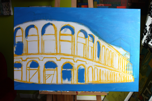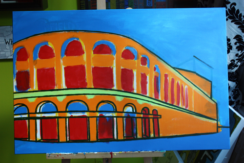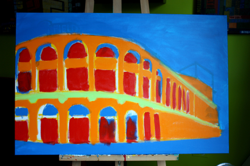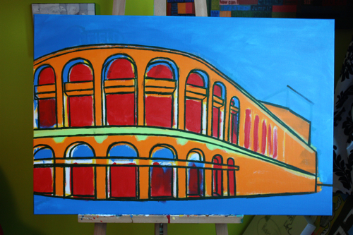 This picture was taken on my first visit. The dramatic night time facade makes it a terrific painting subject. After the jump, a stroke-by-stroke play-by-play of each inning.