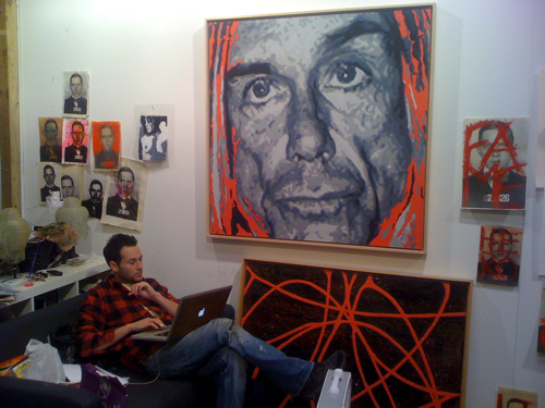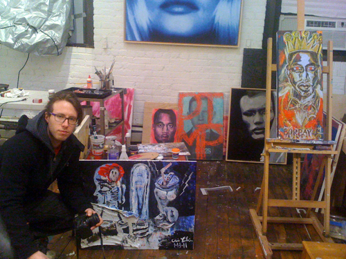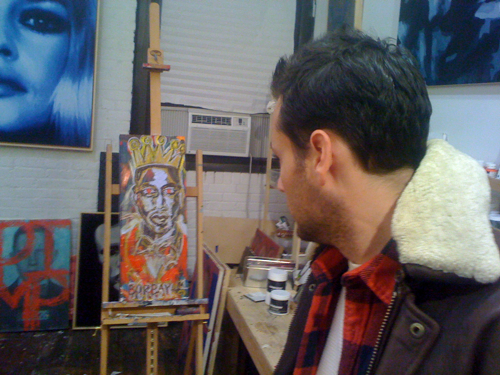 The second portrait in my series following Jay-Z will be Kanye. To prepare, I hung out with some H.A.M.’s last night. The location? Jeremy Penn‘s studio. The event? Four Loko, hip-hop beats and three artists slinging paint. After the jump, a quasi-Kanye study and some atelier shots.