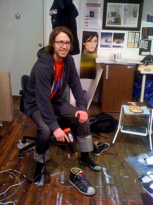 Ari and me stepped in a monster ice puddle on 23rd Street, so here he is drying his shoes with Jeremy’s heat gun.