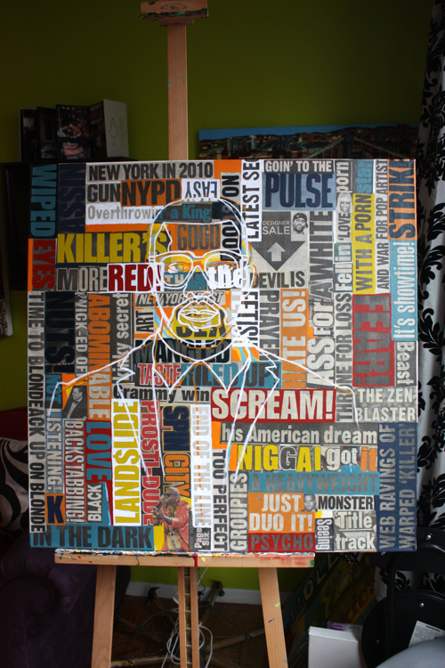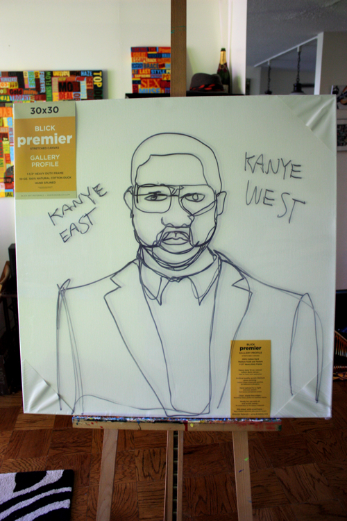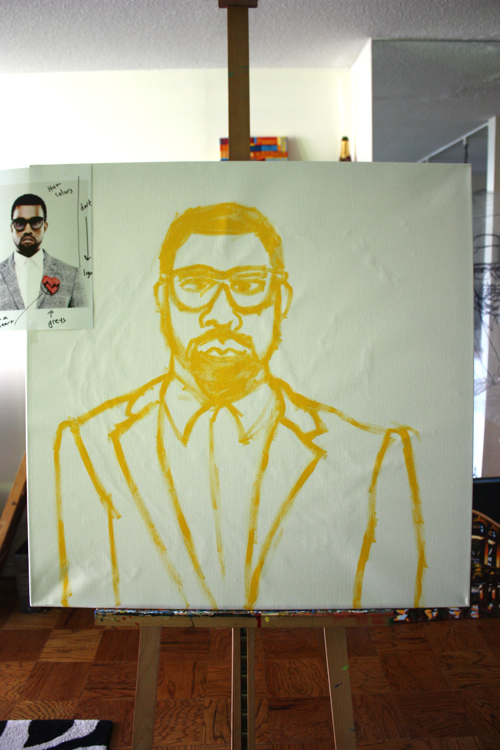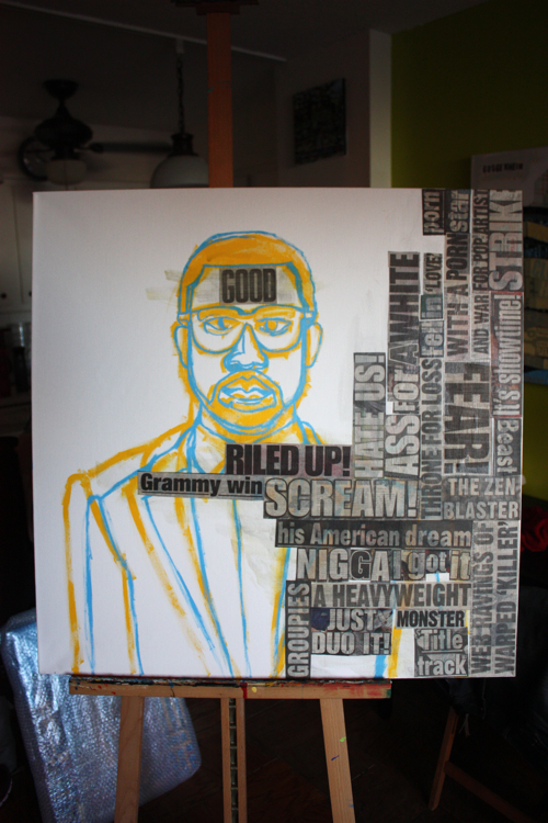 “everybody know (Im a motherfucking monster)”; the Kanye at the bottom of the canvas is a constant reminder to let me finish the painting.