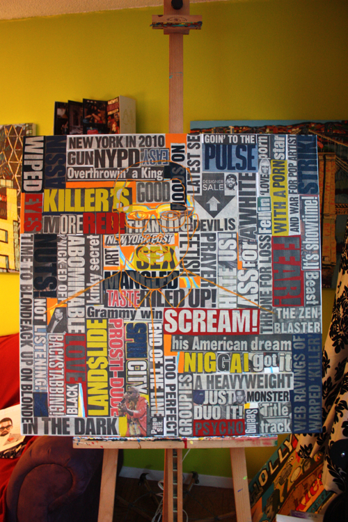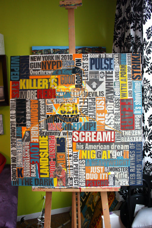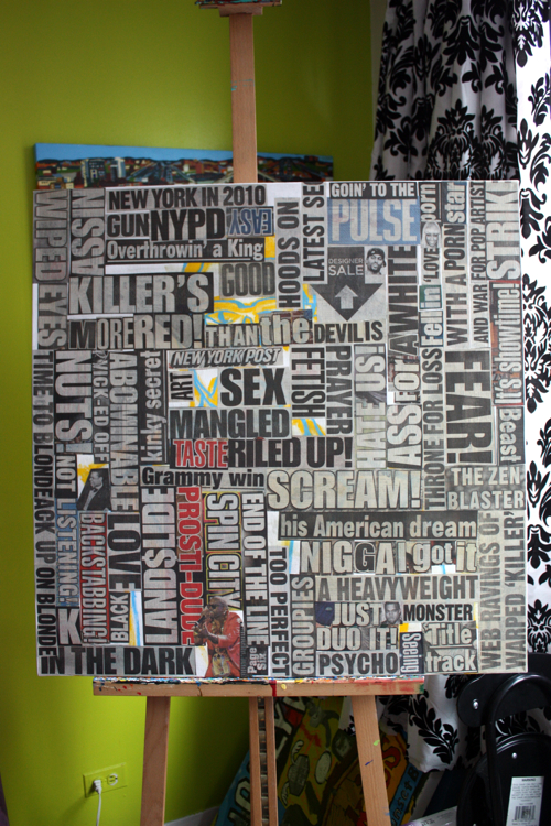 “…choke a southpark writer with a fishstick”; Ah, the boys at Southpark and their Kanye episode. At this stage, building up the color field, choking the newspaper’s natural color.