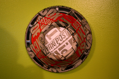 Starting out with a layer of New York Post, masthead front and center. Process achieved with a wide paint brush, acrylic gel medium and a great deal of whiskey patience.