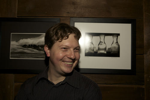 Photographer Greg McMahon in front of his work.
