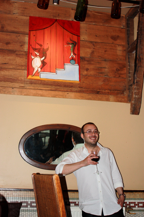 Artist Paul Zepeda enjoying a glass of wine in the ambiance of his painting, Cirque.