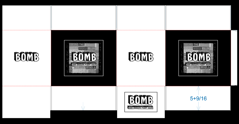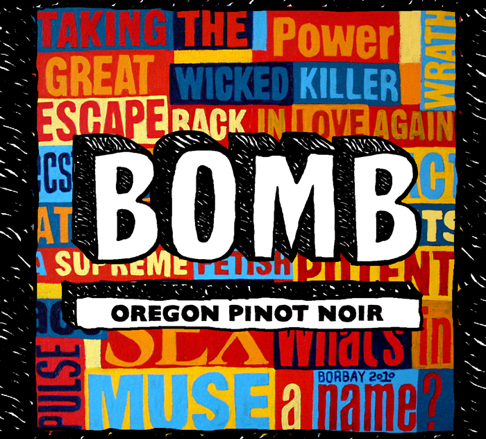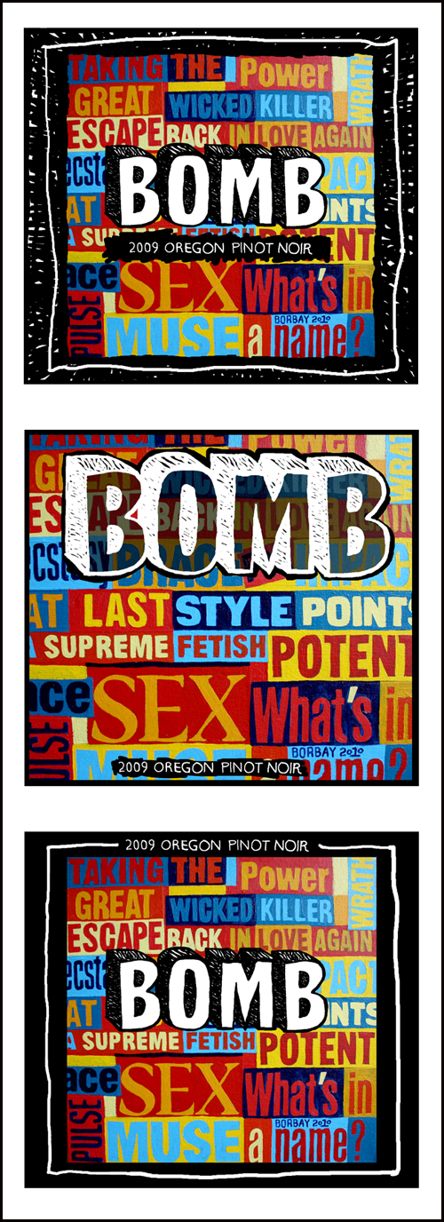 After a few conceptual meetings, we decided to move forward with a commissioned collage painting and logo design for Bomb’s first wine release: a 2009 Oregon Pinot Noir. The objective was to create a colorful, hand-crafted, explosive visual identity — apropos for a brand with the name “BOMB”.