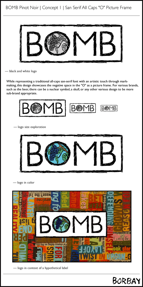 My first iteration was a hand-outlined version of BOMB in Gil Sans, created on my Bamboo Tablet. I decided to explore filling in the “O” with grapes, drawn from a photograph taken in Oregon. This version was a bit tame in context of the painting background. On to the next one.