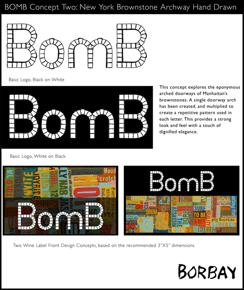 When I was walking down the street, I found myself captivated by the brownstone archways. Based on a photo, I created a vector representation of the stones, crude bumps and all, and cobbled together the name “Bomb” based on the repetition of the singular u-shaped arc. As with direction one, there was potential but it wasn’t exactly the right fit.
