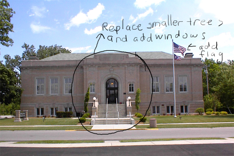 Susan said yes, and added she’d love for me to paint an important landmark in her hometown some day. Well, sure enough, Susan sent the photos, and about eight months later — Paulding County in Ohio commissioned this painting of their historical Carnegie Library.