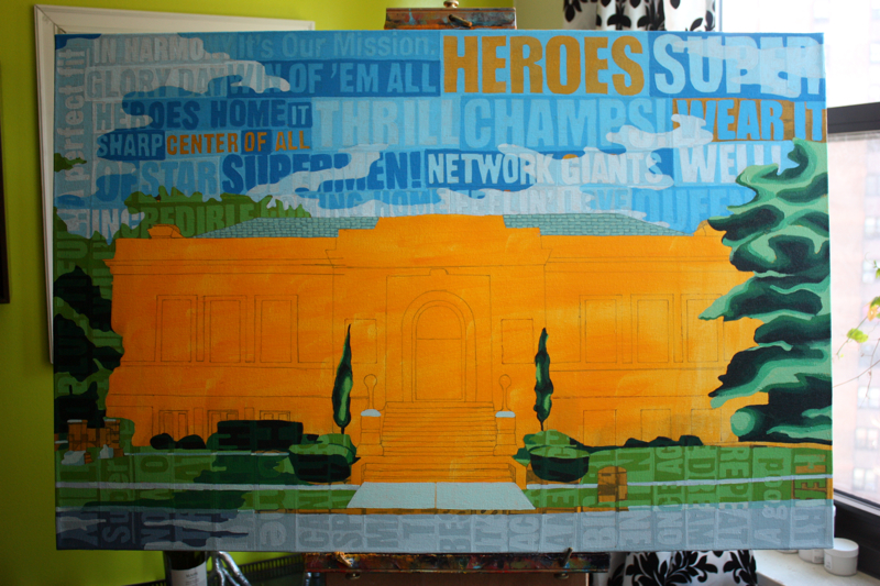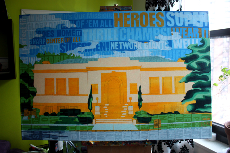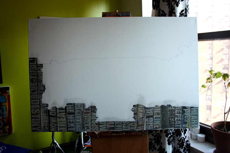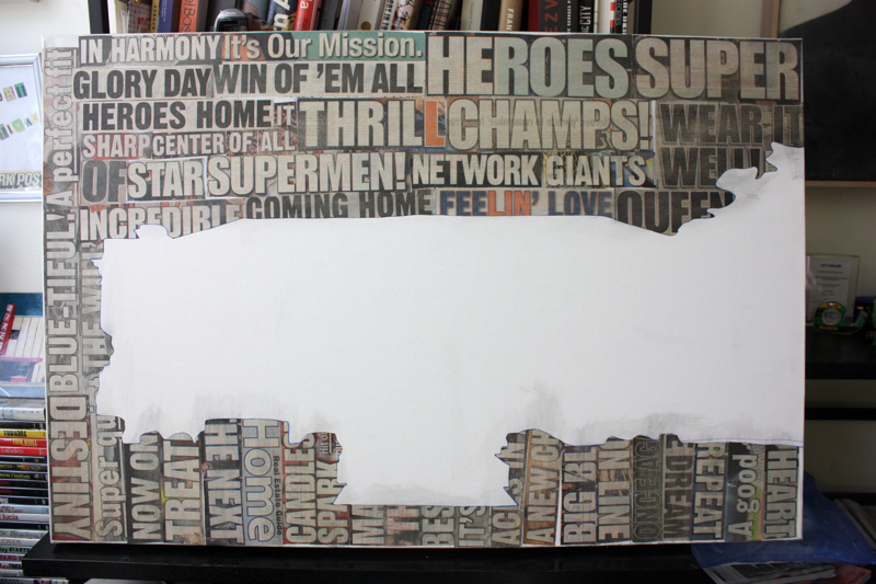 Starting out the 24″X36″ canvas with a basic outline of the building, and collaged headlines trimmed to form.