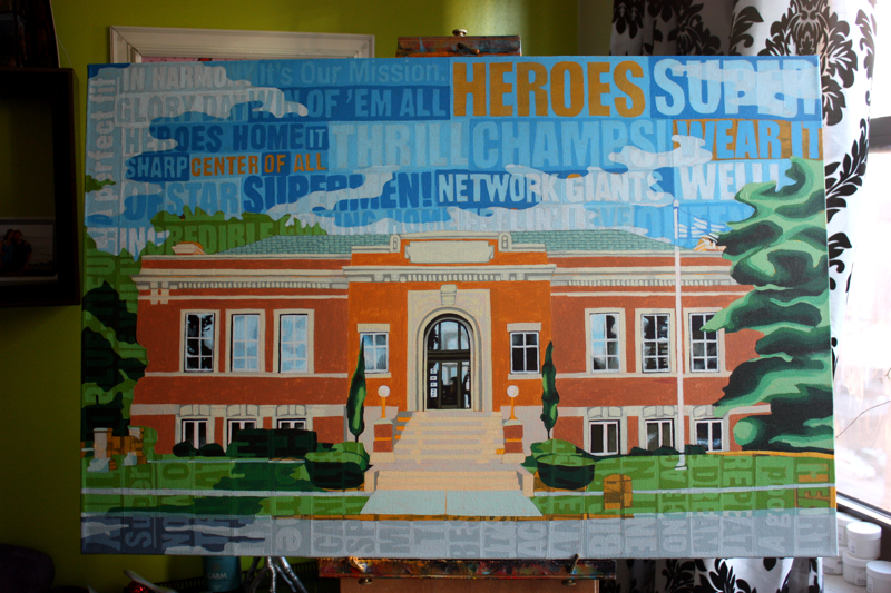 The content was carefully chosen to add a literary flare to both the history of the Carnegie Library and surface of the canvas.