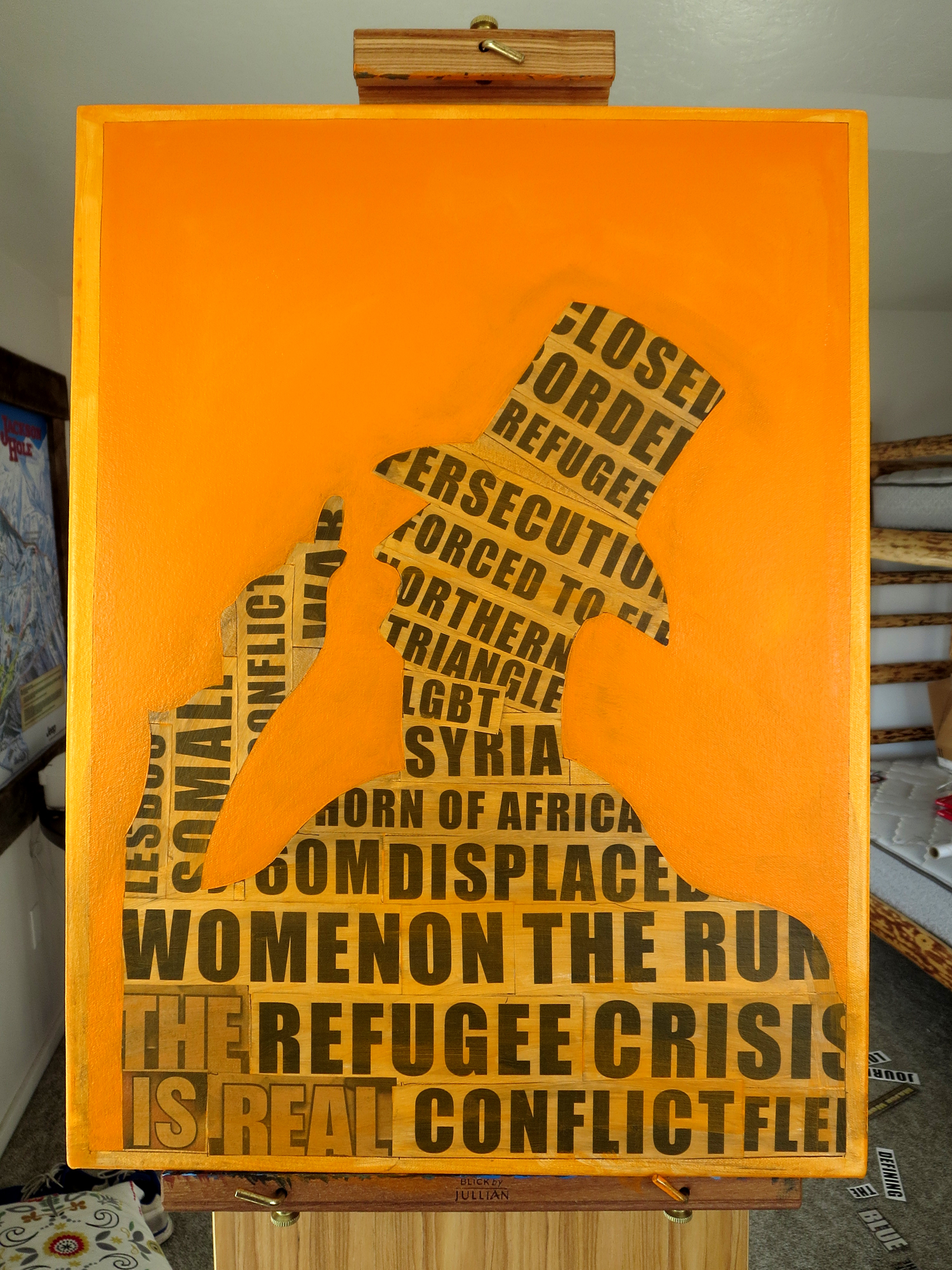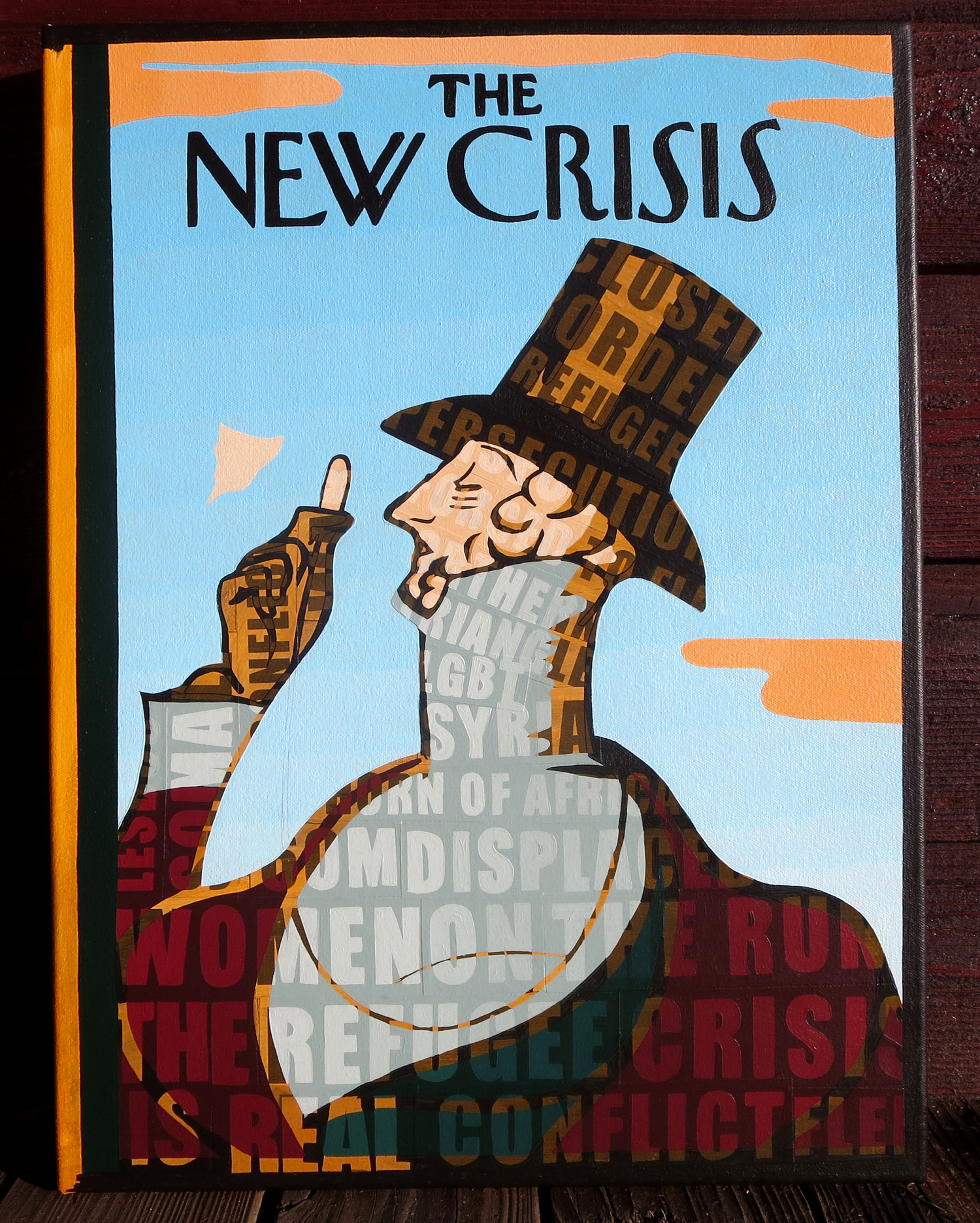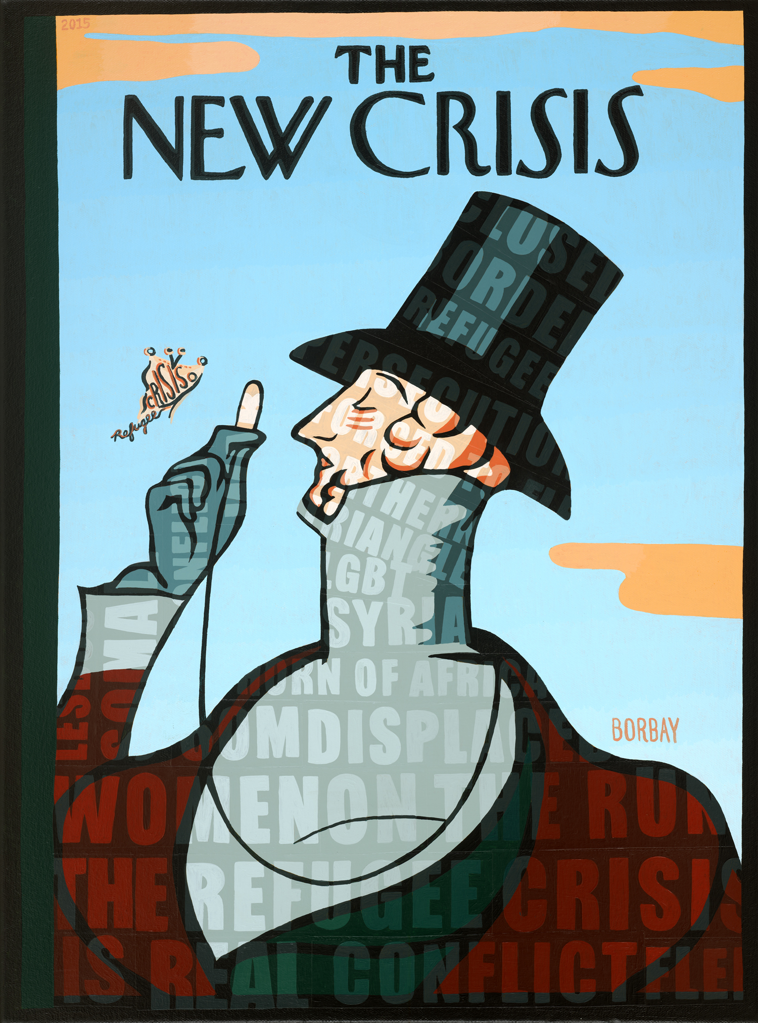 The concept? A New Yorker-inspired painting, addressing the Global Refugee Crisis. Brian’s original 9th Avenue World View idea, transformed to a modern take on the original New Yorker cover, featuring Eustace Tilley… the New York Dandy.