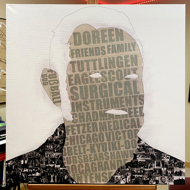 With linen canvases, I always apply two additional layers of gesso. This helps smooth the surface, and makes for desirable, air-bubble-free collage results. Here, you can see the basic form, with headlines and images — curated to capture the life of Bene.